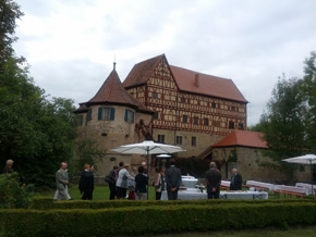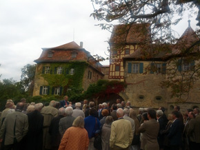 Nach dem Rundblick über das Neustädter Becken und Besichtigung der Ausgrabungen auf dem Veitsberg wurden die Gäste in Schloss Unsleben von Graf und Gräfin Waldburg-Wolfegg und Mitgliedern des Freundeskreises Wasserschloss Unsleben erwartet. Führungen, ein Grußwort von Landrat Thomas Habermann und ein großzügiger Empfang durch die Eigentümer im Garten des romantischen Schlosses, das als besonderes Kulturgut geschützt ist, beschlossen die Exkursion.